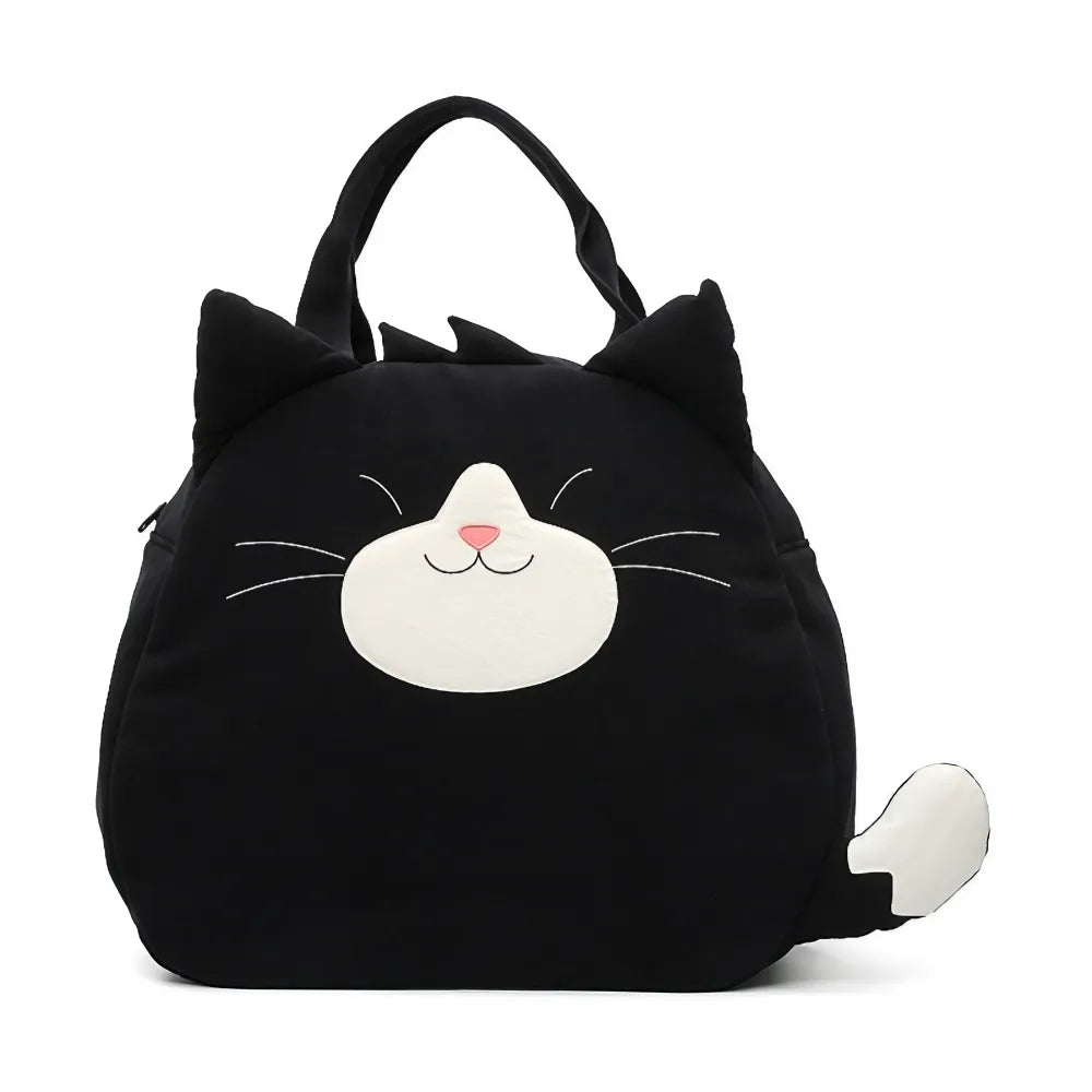 Elevate your fashion game with the Handbag, featuring a harmonious black and white scheme embellished with an cute cat motif. The artistic rendition of cat ears and a protruding tail brings the design to life, striking a perfect balance between edgy and cute. Its spacious interior accommodates up to a 15.6-inch laptop and daily essentials, combining functionality and aesthetics. Crafted from pure cotton, it remains lightweight for easy carrying, ensuring both fashion-forwardness and a youthful charm.